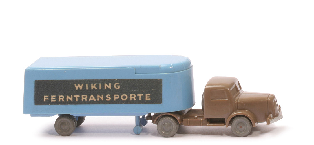 Achsen | Rollachser | | Zugmaschine | Farbe Kabine | blassbraun | Farbe Chassis | blassbraun | Bemalung | Scheinwerfer, Stoßstange | Sattelpfanne | eingesetzt, in Chassisfarbe | Chassis | Version 1a | Achshalterungen | geschlossen | Bodenprägung | WM (ohne Kreis) | Reserverad | hinter Kabine | Räder | 10 mm, mit Profil, ca. basaltgrau | | Auflieger | Farbe Oberteil | lilablau | Farbe Unterteil | lilablau | Radlauf | ohne Kotflügel | Bodenprägung | WM im Kreis | Rückleuchten | ohne | Dach | glänzend | Aufkleberart | Papier, matt | Beschriftung | Ferntransporte (s. Foto) | Beschriftung Farbe | stahlblau mit weißer Schrift | Räder | 10mm, mit Profil, ca. basaltgrau |