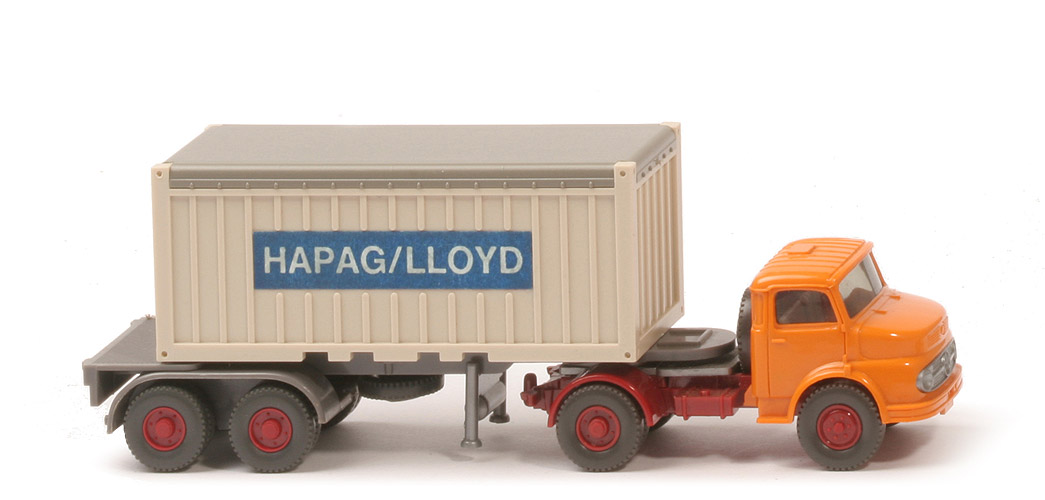 | Zugmaschine | Kabine | gelborange | Lüfter | mit | Eckfenster | mit | Blinker | auf Kotflügel | Inneneinrichtung | ca. silbergrau | Verglasung | getönt | Chassis | hellbraunrot | Radlauf hinten | hellbraunrot | Sattelpfanne | für großen Königsbolzen | Reserverad | hinter Kabine | Räder | Profil grob | Felgen | hellbraunrot | | Container | Art | Open Top | Dach | betongrau | Korpus | hellelfenbein | Beschriftung | Hapag-Lloyd (s. Foto) | Beschriftung Art | Papieraufkleber | | Auflieger | Farbe | basaltgrau | Variante | mit Markierung, BP 52 h | DAA Farbe | basaltgrau | Achshalterung | Klemmplatte | Königsbolzen | stark | Räder | Profil grob | Felgen | hellbraunrot |