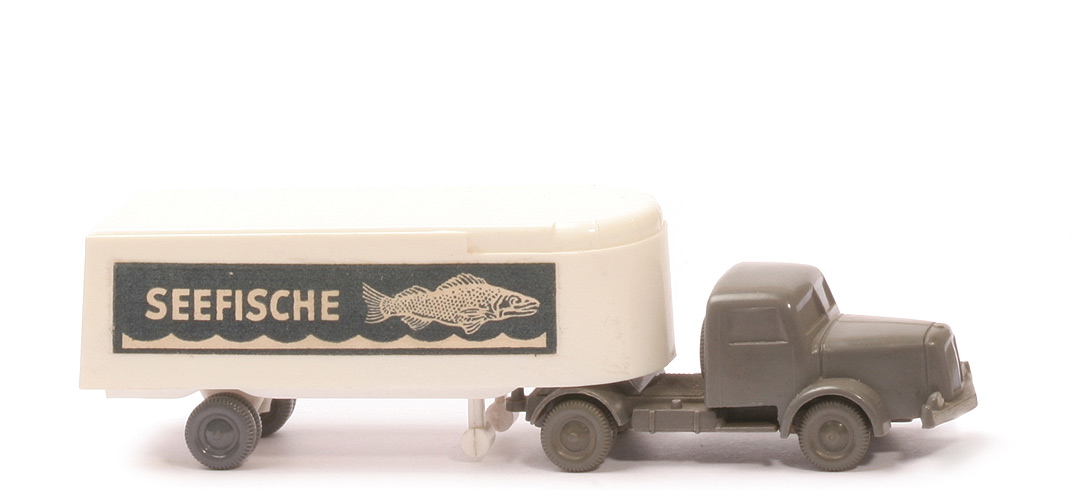 Achsen | Rollachser | | Zugmaschine | Farbe Kabine | basaltgrau | Farbe Chassis | basaltgrau | Bemalung | Scheinwerfer, Stoßstange | Sattelpfanne | eingesetzt, in Chassisfarbe | Chassis | Version 1a | Achshalterungen | geschlossen | Bodenprägung | WM (ohne Kreis) | Reserverad | hinter Kabine | Räder | 10 mm, ältere Version | | Auflieger | Farbe Oberteil | weiß | Farbe Unterteil | weiß | Radlauf | ohne Kotflügel | Bodenprägung | WM im Kreis | Rückleuchten | ohne | Dach | glänzend | Aufkleberart | Papier, matt | Beschriftung | Seefische blau/weiß (s. Foto) | Art Beschriftung | Papieraufkleber | Räder | 10 mm, ältere Version |