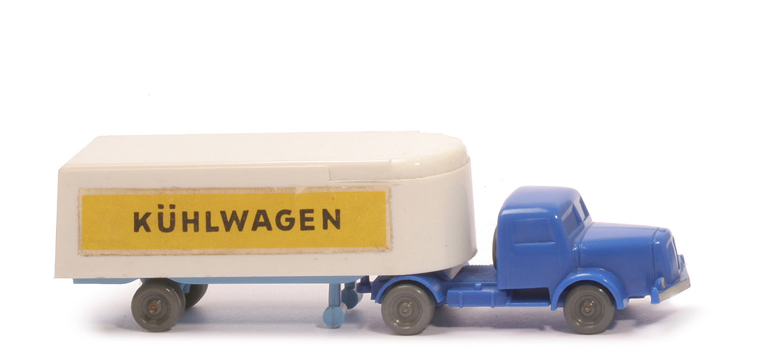 Achsen | Rollachser | | Zugmaschine | Farbe Kabine | ultramarin | Farbe Chassis | ultramarin | Bemalung | Scheinwerfer und Stoßstange silbern | Sattelpfanne | eingesetzt, in Chassisfarbe | Chassis | Version 1a | Achshalterungen | geschlossen | Bodenprägung | WM im Kreis | Reserverad | hinter Kabine | Räder | ohne Profil, dunkelbasaltgrau | | Auflieger | Farbe Oberteil | weiß | Farbe Unterteil | lilablau | Radlauf | ohne Kotflügel | Bodenprägung | WM im Kreis | Rückleuchten | ohne | Dach | glänzend | Aufkleberart | Papier, matt | Beschriftung | Kühlwagen (s. Foto) | Beschriftung Farbe | gelb mit schwarzer Schrift | Räder | ohne Profil, dunkelbasaltgrau |