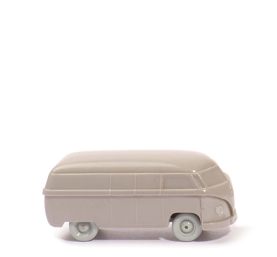 Achsen | Rollachser | Karosserie oben | hellgraubeige | Seite | mit einem Seitenfenster | Front | VW Emblem | Karosserie unten | hellgraubeige | Bodenprägung | WM (im Kreis) | Bemalung Scheinwerfer | silbern | Bemalung Stoßstange vorne | ohne | Bemalung Heck | ohne | Räder Typ | 8 mm, ohne Profil | Räder Farbe | sog. Porzellanräder |