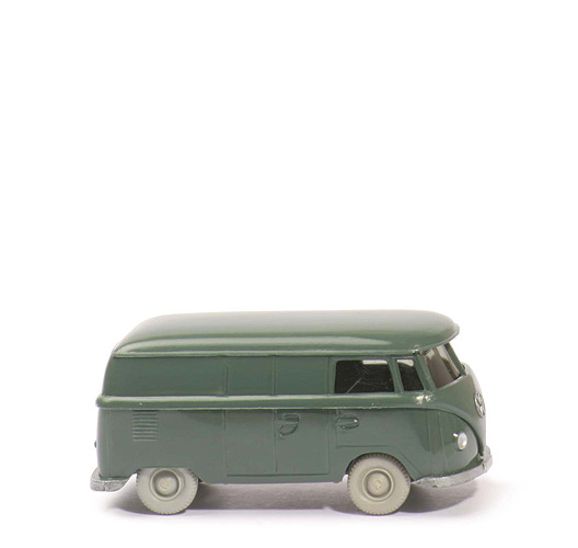 Farbe Karosserie oben | graugrün | Farbe Karosserie unten | graugrün | Heckscheibe | klein | Chassis | Teil des Karosserieunterteils | Chassis Version | Typ A Nest 2 | Bodenprägung | Made in Germany, WM | Dachaufbau | ohne | Rückleuchten | gering erhaben | Verglasung | Typ 1, getönt | Inneneinrichtung | ohne | Bemalung Stoßstangen | silbern | Bemalung vorne | Scheinwerfer, VW-Emblem silbern | Bemalung hinten | Rückleuchten rot, Kennzeichen silbern | Räder | ca. lichtgrau, Nabe gewölbt |