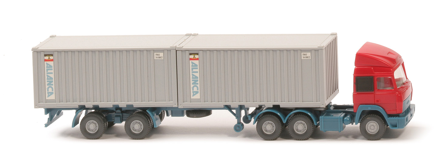Unterschiede zur Serie: Serie bei 20 ft-Container mit DAF, hier Iveco mit Spoiler, hinteres Kabinen- fenster geschlossen. Das Kabinen-Rot ist dunkler als beim Serienmodell mit Iveco mit 40 ft-Container. Dort auch abweichend Stoßstange und Grill basaltgrau. Bei dieser Kabine gibt es mehrere Rot-Töne. |
