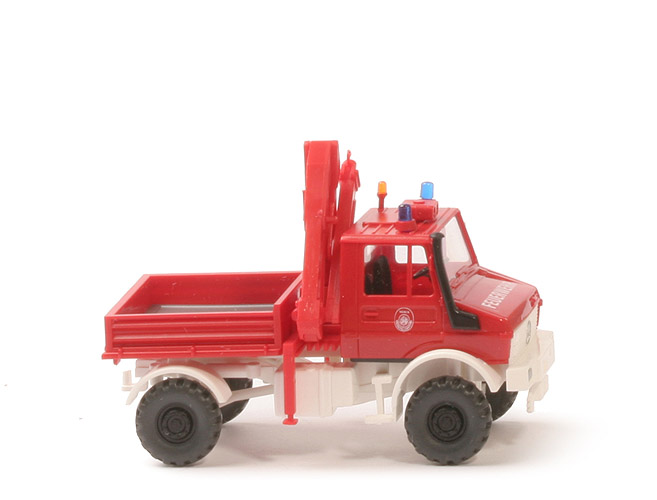 Farbe Kabine | rot | Warnlicht | 2, blau transparent auf Sockel | Verglasung | klar | Inneneinrichtung | schwarz | Lenkrad | separiert | angesetzter Ansaugstutzen | schwarz | Kotflügel vorne/Grill | weiß | Kotflügel hinten | weiß | Chassis Typ | neu, filigran | Chassis Farbe | weiß | Bodenprägung | neues WIKING-Logo | Kardanelement Farbe | weiß | Pritsche | rot | Pritscheneinlage | silbern | Bedruckung Front | "Feuerwehr", MB Stern und Scheinwerfer silbern | Bedruckung Türen | Logo Werkfeuerwehr Merck | Kran | alle Teile rot | Räder | 12 mm, grobstollig, separate Felgen | Felgen | 8-Loch, schwarz |