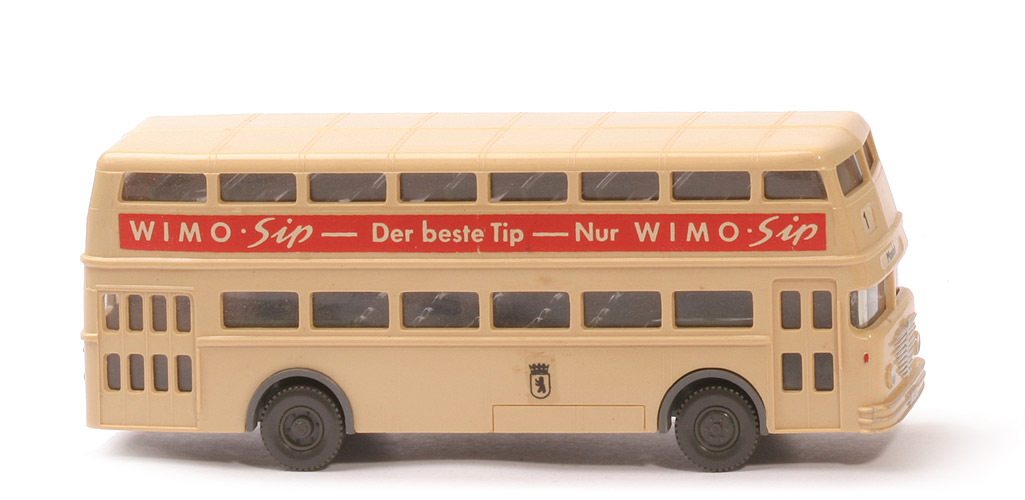 | Karosserie Farbe | hellbeige | | Karosserie Typ | Einstieg hinten geschlossen | | Verglasung | klar | | Fahrer Farbe | ca. staubgrau | | Fahrer Typ | mit Lenkrad vergossen | | Fahrer Bemalung | Gesicht, Hände | | Fahrersitz | ca. resedagrün | | Sitze Farbe | ca. resedagrün | | hintere Fahrgastraumbegrenzung | ohne | | Treppe hinten | ohne | | Chassis Farbe | ca. staubgrau | | Kardanelement Farbe | ca. staubgrau | | Version Chassis | ohne kreisrunde Verstärkung | | Bodenprägung | WM | | Werbebeschriftung | Wimo Sip ... (s. Foto) | | Zielbeschriftung vorne | 1, Moabit schwarz auf weiß | | Stadtwappen | schwarz | | Art der Beschriftung | Abziehbilder | | Bemalung vorne | Scheinwerfer, Büssing-Spinne, Stoßstange silber | | weitere Bemalung | vorne Blinker rot, 4 Rückleuchten rot | | Räder Typ | 12 mm, Profil grob | | Felgen | 6-Loch, anthrazit |