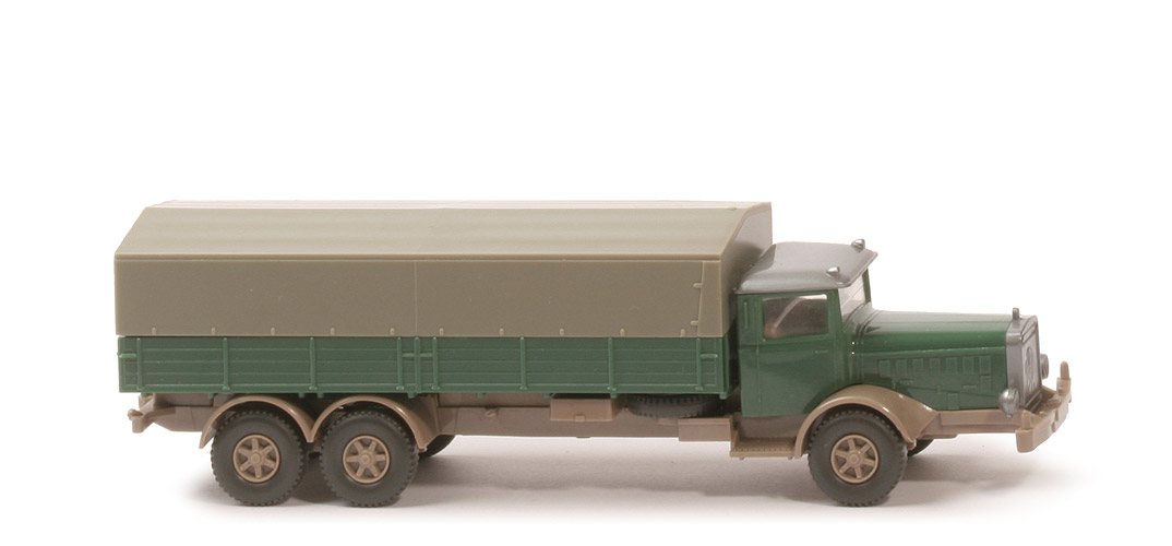 Kabine | patinagrün | Dach | silbern | Verglasung | klar | Inneneinrichtung | rotelfenbein, o. Lkr | Grill | silbern, mit Stern | Chassis Farbe | rotelfenbein | Kardaneinsatz Farbe | rotelfenbein | Kardaneinsatz Bodenprägung | WIKING, Berlin-W | Zughaken | stilisiert | Reserverad | seitlich unter Pritsche | Kotflügel hinten | 2-teilig, rotelfenbein | Pritsche | patinagrün | Pritscheneinlage | Papier, silbern, 3-geteilt | Bemalung | ohne | Plane | ca. zementgrau | Räder | 12 mm, Profil grob | Felgen | Trilex, rotelfenbein |