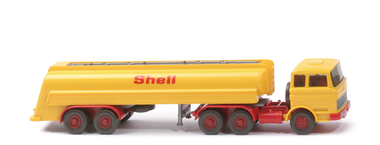 | Zugmaschine | Typ | Dach längsversteift | Kabine | gelb | Spiegel, Lenkrad | ohne | Verglasung | getönt | Inneneinrichtung | ca. hellolivgrau | Stoßstange | rot | Chassis | rot | Halterung Pritsche | ohne | Radlauf hinten | einteilig rot | Reserverad | hinter Kabine | Räder | Profil grob | Felgen | hellbraunrot | | Auflieger | Farbe | gelb | Leiter | nicht gesilbert | Farbe Chassis, Armaturen | silber | Beschriftung Seite | SHELL gemischt 23mm | Beschriftung Art | Druck (!) | Beschriftung Heck | altes Logo | Beschriftung Art | Folie | DAA Farbe | rot | DAA Typ | Klemmplatte | Bodenprägung Chassis | nur Wiking | Königsbolzen | groß | Reserverad | gesteckt | Räder | Profil grob | Felgen | hellbraunrot |