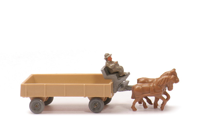 | Räder | Drahtachser | | Pritschentyp | ohne Querverbretterung | | Farbe Pritsche | beige | | Deichselrest | mit | | Pritschenboden | mit Struktur | | Zughaken | integriert, nach unten | | Deichsel/Kutschbock | silbern | | Quersteg Deichsel | mit | | Farbe linkes Pferd | ca. ockerbraun | | Farbe rechtes Pferd | ca. ockerbraun | | Kutscher Typ | Hut | | Kutscher Farbe | ca. braunelfenbein metallic | | Kutscher Bemalung | Gesicht, Hände | | Räder | basaltgrau |