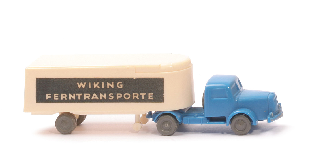 Achsen | Rollachser | | Zugmaschine | Farbe Kabine | himmelblau | Farbe Chassis | himmelblau | Bemalung | Scheinwerfer, Stoßstange | Sattelpfanne | eingesetzt, in Chassisfarbe | Chassis | Version 1a | Achshalterungen | geschlossen | Bodenprägung | WM (ohne Kreis) | Reserverad | hinter Kabine | Räder | 10 mm, mit Profil, ca. basaltgrau | | Auflieger | Farbe Oberteil | cremeweiß | Farbe Unterteil | cremeweiß | Radlauf | ohne Kotflügel | Bodenprägung | WM im Kreis | Rückleuchten | ohne | Dach | glänzend | Aufkleberart | Papier, matt | Beschriftung | Ferntransporte (s. Foto) | Beschriftung Farbe | stahlblau mit weißer Schrift | Räder | 10mm, mit Profil, ca. basaltgrau |