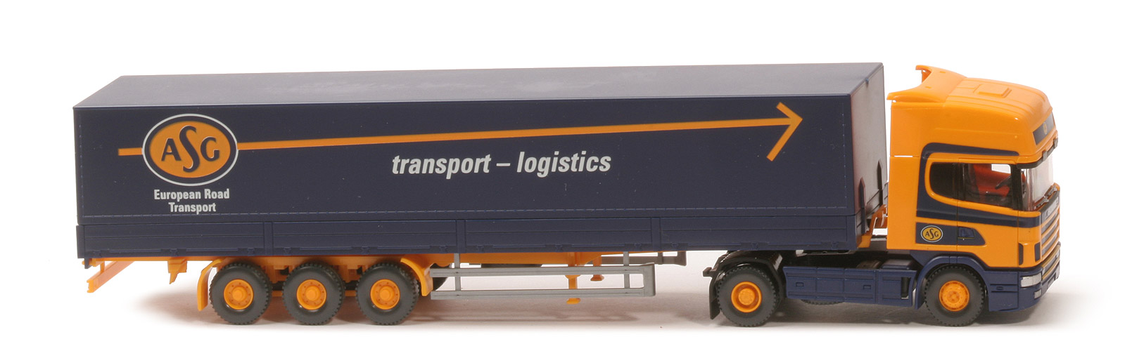 | Zugwagen | Dach | melonengelb, Frontdruck "ASG" auf stahlblauem Feld | Kabine | melonengelb, Dekordruck stahlblau | Verglasung | klar | Inneneinrichtung | schwarz, Lenkrad separat | Fensterrahmen, Wischer | schwarz bedruckt | Grill | hellstahlblau eingesetzt, "Scania" silber | Scheinwerfer | silbern | Druck Typenbezeichnung | 144L - 500 silbern | Stoßstange, Radlauf vorn | hellstahlblau | Seitenverkleidung | hellstahlblau | Chassis, Kardanelement | anthrazitgrau | hier Bodenprägung | neues WIKING-Logo | Sattelpfanne | Teil des Chassis | Kotflügel hinten | schwarz | Reserverad | unter Chassis | | Auflieger | Pritsche | hellstahlblau, BP neues WIKING-Logo, Germany | Pritscheneinlage | Pappe silbern | Plane | hellstahlblau | Chassis | melonengelb | Kotflügel | melonengelb | Unterfahrschutz Seiten | silbern | Stützen | melonengelb | Beschriftung Plane Seiten | "ASG, European Road Transport, transport - logistics", ... | Beschriftung Plane hinten | "ASG, European Road Transport" | | Räder | Typ | 12mm, Felgen eingesetzt | Felgen | 8-Loch, melonengelb |