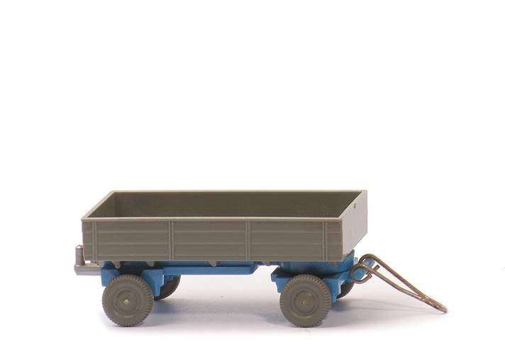 | Pritsche | Pritsche Farbe | betongrau | Pritschenseiten | Struktur | Pritscheneinlage | ohne | Kennzeichen hinten | zweiteilig | | Chassis | Chassis Farbe | lichtblau | Chassis Variante | Typ 1 | Achshalterungen | geschlossen | Drehschemel | vernietet | Bodenprägung Drehschemel | ohne | Bodenprägung Chassis | ohne | Zughaken | silbern, eingesetzt in Chassisschlitz | | weitere Details | Deichsel | Metall | Bemalung Rückleuchten | rot | Bemalung Kennzeichen | silbern | Räder | 10mm, mit Profil, staubgrau, älterer Typ |
