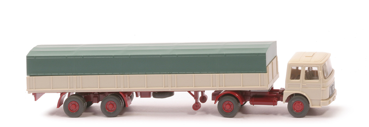 | Zugmaschine | Fahrerhaus | hellelfenbein | Verglasung | klar | Inneneinrichtung | mit Lenkrad | Spiegel | mit | Scheibenwischer | ohne | Lüftergitter | ohne | Grill | silbern, mit Löwe | Motorblock | silbern | Chassis | hellbraunrot | | Auflieger | Pritsche | hellelfenbein | Chassis | hellbraunrot | Achseinheit | hellbraunrot | Pritscheneinlage | Pappe, silber | Plane | patinagrün | Druck | ohne | Stützen | als Rollen | Räder | 12mm, Profil grob | Felgen | hellbraunrot |