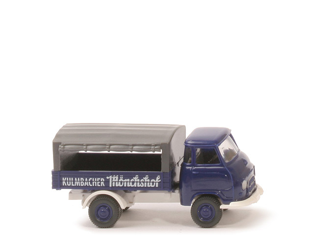 | Kabine | stahlblau | | Verglasung | klar | | Bemalung Scheinwerfer | silber | | Bemalung Kennzeichen | ohne | | Grill | schwarz hinterlegt, Umrandung, Zierlinien, "Kurier" silbern | | Inneneinrichtung | ca. staubgrau, Lkr separat | | Chassis | weiß | | Bodenprägung | WIKING, Germany (alt) | | Pritsche | stahlblau | | Druck Pritsche | "Kulmbacher Mönchshof" | | Rückleuchten | unbemalt | | Nummernschild hinten | unbemalt | | Plane | ca. basaltgrau | | Räder | 9 mm, Felge eingesetzt | | Felgen | stahlblau |