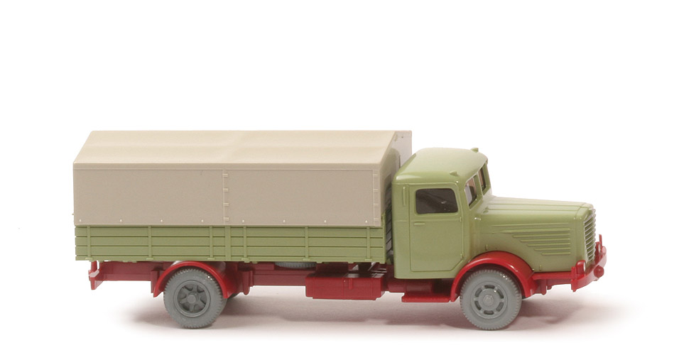 Kabine | helles resedagrün | Verglasung | getönt | Inneneinrichtung | ohne | Bedruckung Scheinwerfer | silbern | Bedruckung Grill | silbern | Warndreieck | ohne | Chassis Farbe | helles braunrot | Chassis Typ | fein detailliert, durchbrochen | Bodenprägung | neues WIKING-Logo, Germany | Zughaken | klein | Reserverad | auf Chassis | Bedruckung Rückleuchten | rot | Pritsche | helles resedagrün | Pritscheneinlage | ohne | Räder Typ | 12 mm, einteilig mit Trilexfelge | Räder Farbe | ca. staubgrau | Plane | geschlossen, ca. perlweiß |