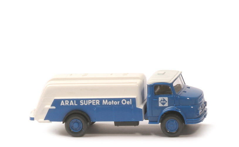 Version Kabine | mit Dachlüfter, Grill integriert | Farbe Kabine | "verkehrsblau" | Verglasung | klar | Bedruckung Front | Scheinwerfer und Grill silbern | Bedruckung Dach | weiß | Bedruckung Tür | ARAL-Logo | Inneneinrichtung | ca. basaltgrau | Kotflügel hinten | stark | Bodenprägungen | nicht ersichtlich | Chassisfarbe | schwarz | Tank | weiß | Beschriftung | ARAL Super Motor Oel | Beschriftung Art | Negativdruck (s. Foto) weiß/"verkehrblau" | Bedruckung Rückleuchten | rot | Bedruckung Stoßstange hinten | "verkehrsblau" | Räder | 11 mm, Felgen eingesetzt | Felgen | "verkehrsblau", 6-Loch |