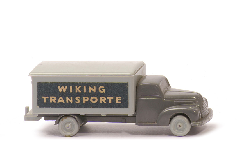 Achsen | Rollachser | Farbe Kabine u. Chassis | basaltgrau | Kabinenboden | Platte silbern | Bodenplatte Prägung | WM im Kreis | Bemalung Kabine | Scheinwerfer, Stoßstange | Koffer Farbe | silbergrau | Koffer Unterteil Farbe | silbergrau | Türen | silbergrau | Koffer Typ | Version 1a | Zughaken | im Kofferunterteil integriert | Beschriftung | Wiking Transporte (s. Foto) | Beschriftung Farben | stahlblau mit weißer Schrift | Beschriftung Art | Papieraufkleber | Räder | sog. Porzellanräder |