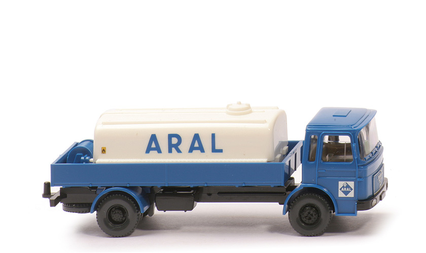 | Fahrerhaus | maritimblau | | Bedruckung Türen | Aral-Logo | | Verglasung | klar | | Inneneinrichtung | ca. staubgrau, mit integriertem Lkr | | Grill | maritimblau, eingesetzt, Rand, Schift, Logo silbern | | Scheinwerfer | gesilbert | | Chassis | schwarz, Bodenprägung neues WIKING-Logo, Germany | | Zughaken | kurz (ca. 5 mm) | | Radlauf hinten | maritimblau | | Reserverad | hinten unter Chassis, 12 mm | | Pritsche | maritimblau | | Pritscheneinlage | ohne | | Tank | weiß | | Bedruckung | "ARAL", Gefahrensymbol Feuer | | Tankunterbau | maritimblau | | Räder | 12mm, Profil grob | | Felgen | schwarz |
