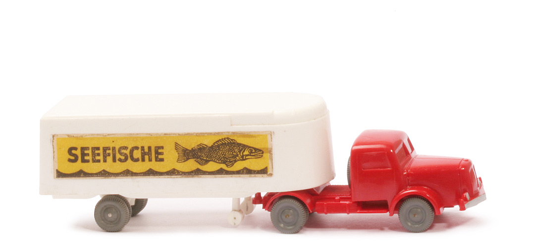 Achsen | Rollachser | | Zugmaschine | Farbe Kabine | rot | Farbe Chassis | rot | Bemalung | Scheinwerfer, Stoßstange | Sattelpfanne | eingesetzt, in Chassisfarbe | Chassis | Version 1a | Achshalterungen | geschlossen | Bodenprägung | WM (ohne Kreis) | Reserverad | hinter Kabine | Räder | 11 mm, ältere Version | | Auflieger | Farbe Oberteil | weiß | Farbe Unterteil | weiß | Radlauf | ohne Kotflügel | Bodenprägung | WM im Kreis | Rückleuchten | ohne | Dach | glänzend | Aufkleberart | Papier, matt | Beschriftung | Seefische schwarz/gelb (s. Foto) | Räder | 11 mm, ältere Version |