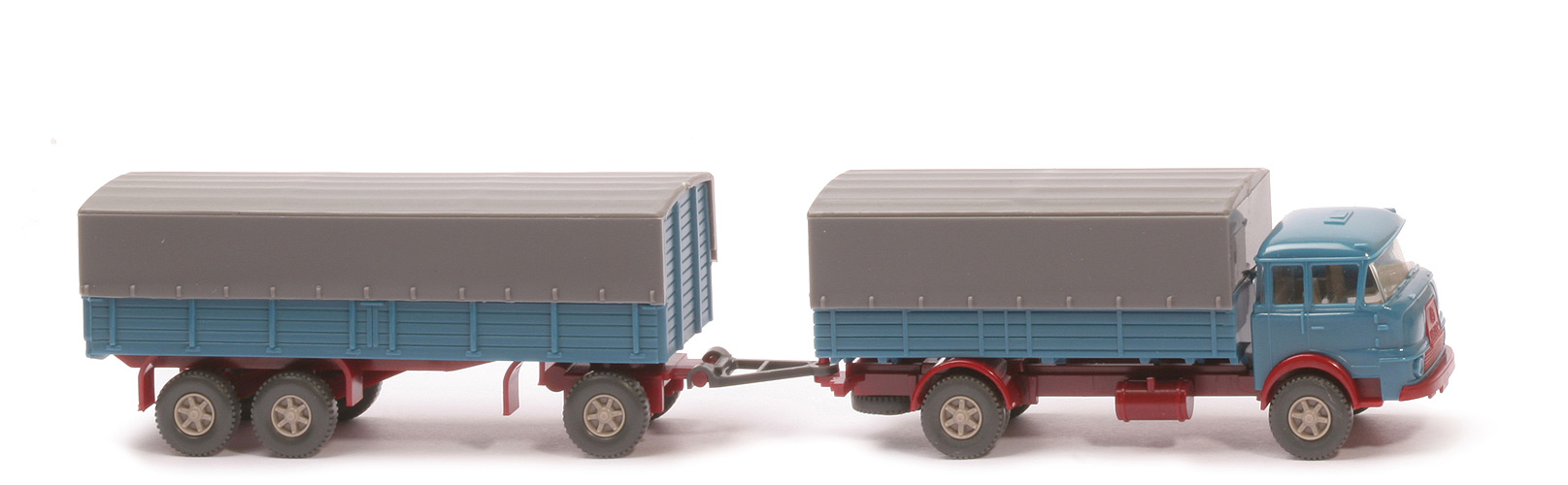| Zugwagen | Kabine | azurblau | Grill | hellbraunrot eingesetzt | Verglasung | klar | Inneneinrichtung | ca. graubeige, Lkr integriert | Stoßstange | hellbraunrot | Chassis | hellbraunrot | Reserverad | hinten unter Chassis | Pritsche | azurblau | Plane | basaltgrau | Räder | 12 mm, Profil grob | Felgen | Trilex, rotelfenbein | | Anhänger | Farbe | azurblau | Rückleuchten | mit | Herstellerkennung Pritsche | WM | Chassis | hellbraunrot | Herstellerkennung Chassis | Germany | Achshalterungen | offen, hellbraunrot | Achshalterungen Typ | gerade | Drehschemel | eingesteckt | Deichsel | beweglich, angesteckt, Kunststoff | Plane | geschlossen, basaltgrau | Reserverad | ohne | Räder | 12 mm, Profil grob | Felgen | Trilex, rotelfenbein |