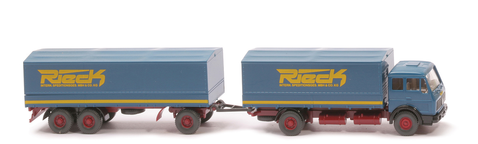 | Zugwagen | Kabine | capriblau | eingesetzter Grill | schwarz, ohne Streifen | Lüfter | hoch | Heckfenster | geschlossen | Spiegelaufnahmen | ohne | Inneneinrichtung | ca. hellolivgrau | Stoßstange | schwarz | Chassis | hellbraunrot | Radlauf hinten | schwarz | Reserverad | hinten unter Chassis | Pritsche | capriblau | Pritscheneinlage | Pappe, silbern | Planen | capriblau | Beschriftung Plane | Rieck ... (s. Foto) | Beschriftung Pritsche | umlaufender Streifen | Räder | Profil grob | Felgen | 10-Loch, hellbraunrot | | Anhänger | Pritsche | capriblau | Chassis | hellbraunrot | Drehschemel | schwarz | Doppelachsaggregat | hellbraunrot | Pritscheneinlage | Pappe, silbern | Planen | capriblau | Beschriftung Plane | Rieck ... (s. Foto) | Beschriftung Pritsche | umlaufender Streifen | Räder | Profil grob | Felgen | 10-Loch, hellbraunrot |