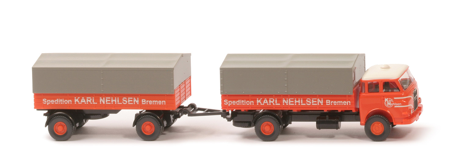 | Pritschenwagen | Fahrerhaus | "verkehrsorange", Dach weiß schabloniert | Verglasung | klar | Inneneinrichtung | schwarz, Lkr integriert | Grill | schwarz, Rand weiß, Schriftzug weiß | Scheinwerfer | silbern | Chassis | schwarz | Chassis Bodenprägung | neues WIKING-Logo | Pritsche | "verkehrsorange" | Pritscheneinlage | ohne | Reserverad | hinten unter Chassis | Zughaken | gerade, verstärkt | Plane | ca. platingrau | Räder | 12 mm, Felgen eingesetzt | Felgen | 6-Loch, "verkehrsorange" | | Anhänger | Pritsche | "verkehrsorange" | Chassis | schwarz | Bodenprägung | neues WIKING-Logo, Made in Germany | Reserverad | unter Chassis | Radläufe | schwarz | Deichsel | Kunststoff, schwarz | Plane | ca. platingrau | Räder | 12 mm, Felgen eingesetzt | Felgen | 6-Loch, "verkehrsorange" | | Bedruckung | Kabine | Karl Nehlsen, Logo und Zierstreifen | Pritschen | "Spedition Karl Nehlsen Bremen" (siehe Foto) |