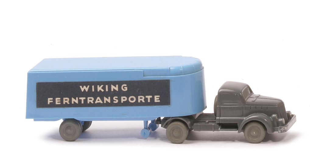 Achsen | Rollachser | | Zugmaschine | Farbe Kabine | basaltgrau | Farbe Chassis | basaltgrau | Bemalung | Scheinwerfer, Stoßstange | Sattelpfanne | eingesetzt, in Chassisfarbe | Chassis | Version 1b | Achshalterungen | geschlossen | Bodenprägung | WM (ohne Kreis) | Reserverad | hinter Kabine | Räder | Profil, ca. basaltgrau | | Auflieger | Farbe Oberteil | lilablau | Farbe Unterteil | lilablau | Radlauf | ohne Kotflügel | Bodenprägung | WM im Kreis | Rückleuchten | ohne | Dach | glänzend | Aufkleberart | Papier, matt | Beschriftung | Ferntransporte (s. Foto) | Beschriftung Farbe | dunkelblau mit weißer Schrift | Räder | Profil, ca. basaltgrau |