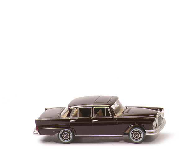 Beeindruckender Bedruckungs-"Komfort": Die Scheinwerfer sind silbern hinterlegt, an den Seiten sind Fensterrahmen silbern bedruckt, ebenso die Türgriffe die Zierleiste unten und an den Heckflossen. Am Heck gibt es einen silbern gedruckten Stern und "230 (!) S" in silbern. Toll! Welch ein Unterschied zum lieblosen Feuerwehrmodell von PMS! |