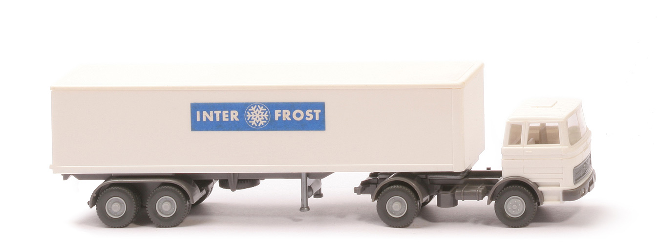 | | Zugmaschine | | Kabine oben | weiß | | Kabine unten | weiß | | Streifen | ohne | | Verglasung | getönt | | Inneneinrichtung | ca. lichtgrau | | Lenkrad | ohne | | Grill | silbern | | Stoßstange, Radlauf vorn | basaltgrau | | Chassistyp | neu | | Chassisfarbe | basaltgrau | | Radlauf hinten | basaltgrau | | Reserverad | ohne | | Sattelpfanne | für großen Königsbolzen | | Räder | 12mm, Profil grob | | Felgen | silbergrau | | Beschriftung Kabine | ohne | | | Auflieger | | Kofferdach | weiß | | Koffer Korpus | weiß | | Türen | weiß | | Kühlaggregat | OHNE (!) | | Chassis | basaltgrau | | Achseinheit | basaltgrau | | Beschriftung Seite | INTER * FROST | | Räder | 12mm, Profil grob | | Felgen | silbergrau | | Art der Beschriftung | Papier-Aufkleber |