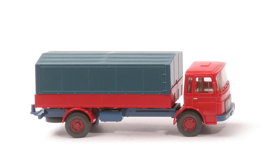 | Pritschenwagen | Fahrerhaus | rot | Verglasung | klar | Inneneinrichtung | ca. graubeige, mit integriertem Lkr | Grill | silbern, eingesetzt | Scheinwerfer | ungesilbert | Chassis | capriblau, Bodenprägung WIKING Berlin-W | Zughaken | lang (ca. 6,5 mm) | Radlauf hinten | rot | Reserverad | hinten unter Chassis, 12 mm | Pritsche | rot | Pritscheneinlage | Kunststoff, ca. lichtgrau | Plane | ozeanblau, hinten offen | Räder | 12mm, Profil grob | Felgen | 6-Loch, hellbraunrot |
