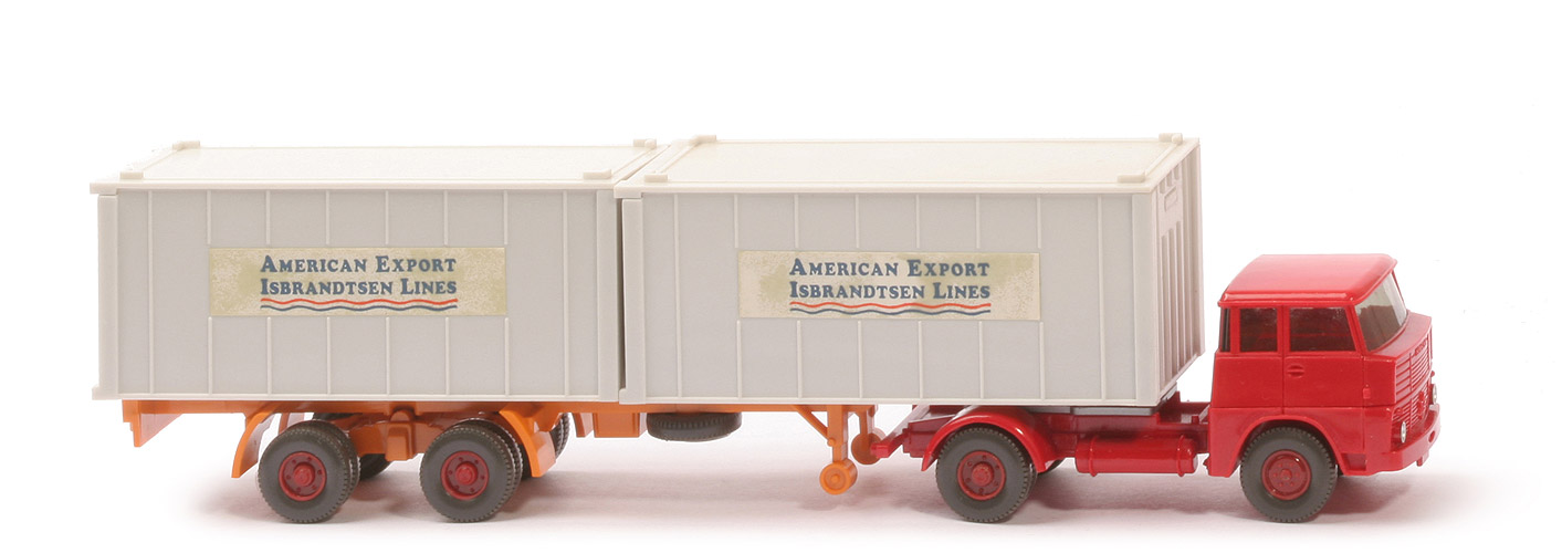 | Zugmaschine | Kabine oben | rot | Kabine unten | rot | Verglasung | getönt | Chassistyp | neu | Zughaken | ohne | Fläche hinter Sattelpfanne | 3 Stege | Chassisfarbe | rot | Sattelpfanne | für dünnen Königsbolzen | Reserverad | ohne | Räder | 12mm, Profil fein | Felgen | hellbraunrot | | Container | Art | 2 x 20 ft, gerippt | Dach | altweiß | Korpus | altweiß | Türen | altweiß | Beschriftung | American Export ... (s. Foto) | Beschriftung Grösse | 5 Felder, Papieraufkleber | | Auflieger | Farbe | gelborange (Werbe) | Unterfahrschutz | ohne | Königsbolzen | dünn | Räder | 12mm, Profil fein | Felgen | hellbraunrot |