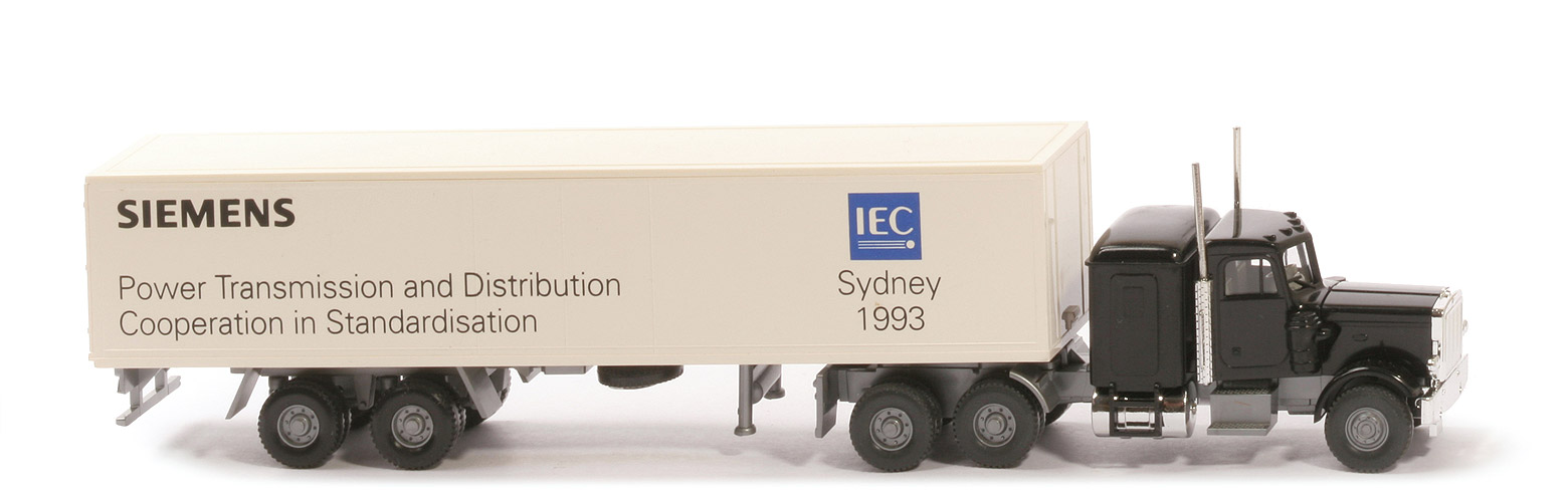 | Zugmaschine | Kabine | schwarz, mit Scheibenwischern | Dach | mit 5 Positionsleuchten | Haube/vordere Kotflügel | schwarz, kippbar, Blinker auf Kotflügel | Seitenaggregate | schwarz | Grill, Scheinwerfer, Stoßst. | verchromt, mit Kennzeichen | Schlafkabine | schwarz | hier Dach | schwarz | Auspuffrohre, Tanks | verchromt | Chassis, Motor, Kotflügel, ... | silbern | Kardanplatte | silbern | hier Bodenprägung | neues WIKING-Logo, Germany, Berlin-W | Sattelpfanne | silbern, für großen Königsbolzen | Bedruckung | ohne | Reserverad | ohne | | Auflieger | Typ | Koffer, Chassis gesteckt | Farbe | weiß | Türen | nicht zu öffnen, weiß | Beschriftung Seiten | "Siemens, Sydney, ..." | Beschriftung hinten | "Siemens, Power Transmission, ..." | Beschriftung Art | Druck blau und schwarz, hinten Pfeil rot | Chassis | silbern, mit Unterfahrschutz | Chassis Bodenprägung | WIKING, Berlin-W | DAA Typ | Klipsachsen, Kotflügel eckig | DAA Farbe | silbern | Reserverad | unter Chassis gesteckt | Stütze | Stempel, silbern | | Räder | Typ | 12 mm, 2-teilig, Felgen eingesetzt | Felgen | 8-Loch silbern |