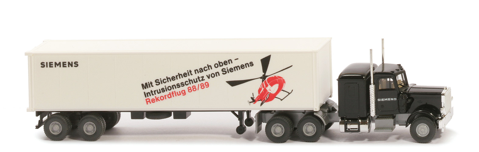 | Zugmaschine | Kabine | schwarz, mit Scheibenwischern | Dach | mit 5 Positionsleuchten | Haube/vordere Kotflügel | schwarz, kippbar, Blinker auf Kotflügel | Seitenaggregate | schwarz | Grill, Scheinwerfer, Stoßst. | verchromt, mit Kennzeichen | Schlafkabine | schwarz | hier Dach | schwarz | Auspuffrohre, Tanks | verchromt | Chassis, Motor, Kotflügel, ... | silbern | Kardanplatte | silbern | hier Bodenprägung | neues WIKING-Logo, Germany, Berlin-W | Sattelpfanne | silbern, für großen Königsbolzen | Bedruckung Türen | "Siemens" | Reserverad | ohne | | Container | Art | Glattwand | Farbe | weiß | Türen | weiß | Beschriftung Seiten | "Siemens, Rekordflug, ..." | Beschriftung vorne | ohne | Beschriftung Art | Druck rot, schwarz | | Auflieger | Typ | für Peterbilt, Achsaggregat nach hinten versetzt | Farbe | schwarz | Reserverad | mittig unter Chassis gesteckt | Unterfahrschutz | mit | Bodenprägung | neues WIKING-Logo, Germany, Berlin-W | | Räder | Typ | 12 mm, 2-teilig, Felgen eingesetzt | Felgen | vorne 6-Loch, hinten 8-Loch silbergrau |