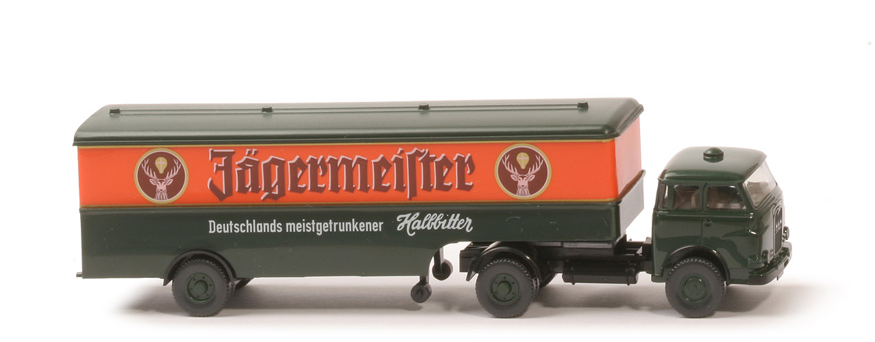 | | Zugmaschine | | Fahrerhaus | tannengrün | | Verglasung | klein | | Sitze | ca. platingrau, mit Armaturenbrett und interiertem Lkr | | Grill | schwarz, Umrandung, "MAN, Diesel" silbern | | Scheinwerfer | silbern | | Chassis | schwarz | | Chassis Bodenprägung | neues WIKING-Logo, Germany | | Rücklichtstange | ohne | | Reserverad | unter Chassis gesteckt | | Sattelpfanne | für großen Königsbolzen | | Räder | 12 mm, zweiteilig | | Räder Felgen | 6-Loch, tannengrün | | | Auflieger | | Farbe Dach | tannengrün | | Farbe oben | hellorange | | Farbe unten | tannengrün | | Bodenprägung | neues WIKING-Logo, Germany | | Türen | neu (mit Scharnierdarstellung) | | Rückleuchten | lang | | Königsbolzen | stark | | Reserverad | mit, geklebt auf Halterung | | Achsaggregat | schwarz | | Stütze | mit Stützrädern, schwarz | | Beschriftung | Jägermeister, ... | | Beschriftung Art | Druck (s. Foto) | | Räder | 12 mm, zweiteilig | | Räder Farbe | 6-Loch, tannengrün |