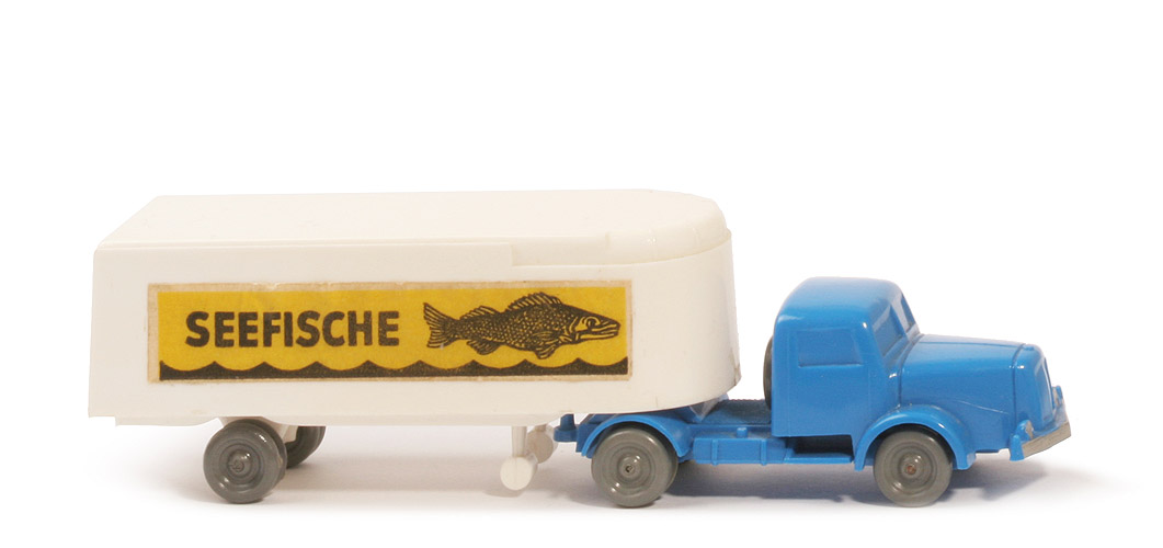 Achsen | Rollachser | | Zugmaschine | Farbe Kabine | himmelblau | Farbe Chassis | himmelblau | Bemalung | Scheinwerfer, Stoßstange | Sattelpfanne | eingesetzt, in Chassisfarbe | Chassis | Version 1a | Achshalterungen | geschlossen | Bodenprägung | WM (ohne Kreis) | Reserverad | hinter Kabine | Räder | 11 mm, o. Profil, basaltgrau | | Auflieger | Farbe Oberteil | weiß | Farbe Unterteil | weiß | Radlauf | ohne Kotflügel | Bodenprägung | WM im Kreis | Rückleuchten | ohne | Dach | glänzend | Aufkleberart | Papier, matt | Beschriftung | Seefische schwarz/gelb (s. Foto) | Räder | 11 mm, o. Profil, dunkelbasaltgrau |