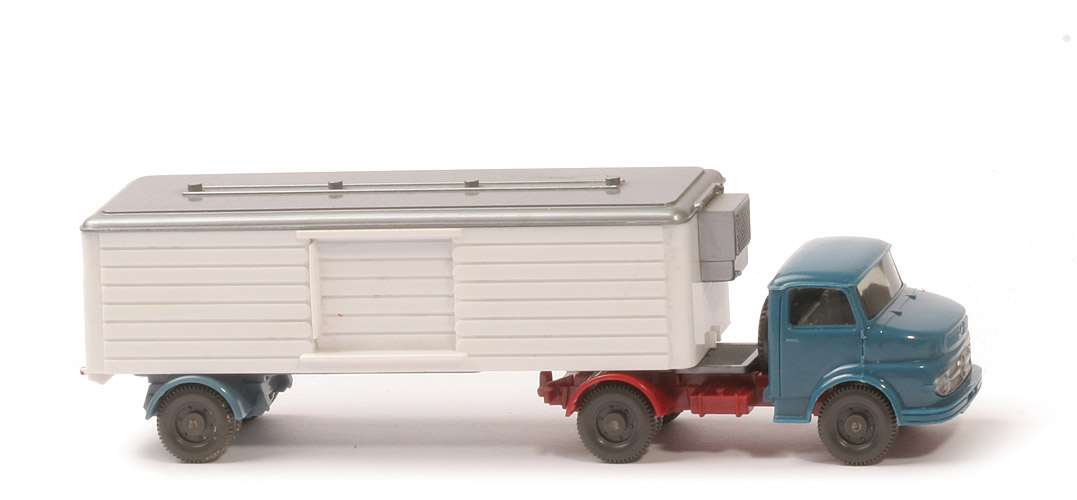| Zugmaschine | Farbe Kabine | azurblau | Lüfter | ohne - Dach glatt | Eckfenster | immer ohne | Blinker | immer neben Scheinwerfern | Inneneinrichtung | ca. hellgelbgrau | Verglasung | leicht getönt | Chassis | hellbraunrot | Radlauf hinten | hellbraunrot | Sattelpfanne | für großen Königsbolzen | Reserverad | hinter Kabine | Räder | 11 mm, anthrazit, Profil fein | | Auflieger | Dach | silbern | Aufbau | weiß | Bodenprägung Aufbau | Wiking Modell, MiG, 52, Viking Model | Kühlaggregat | silbern | Radlauf | mattgraublau | Achshalterungen | Typ 2 | Chassis | mattgraublau | Stützrollen | ohne | Königzapfen | stark, nach hinten versetzt | Bodenprägung Chassis | ohne | Räder | 11 mm, anthrazit, Profil fein |