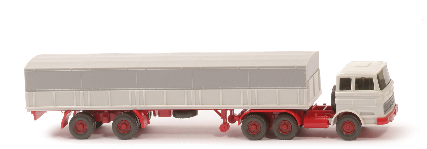 | Zugmaschine | Typ | Dach längsversteift | Kabine | altweiß | Spiegel | ohne | Scheibenwischer | ohne | Verglasung | getönt | Lenkrad | ohne | Inneneinrichtung | ca. hellgelbgrau (?) | Stoßstange | rot, Scheinwerfer gesilbert | Chassis | rot | Zentriernippel für Pritsche | ohne | Radlauf hinten | einteilig rot | Reserverad | hinter Kabine | Sattelpfanne | für großen KöBo | Räder | Profil grob | Felgen | hellbraunrot | | Auflieger | Pritsche Farbe | altweiß | Chassis Farbe | rot | Pritscheneinlage | Pappe, silbern | Plane Farbe | silbergrau | Reserverad | unter Auflieger, gesteckt | Unterfahrschutz | ohne | Königsbolzen | stark | Räder | Profil grob | Felgen | hellbraunrot |