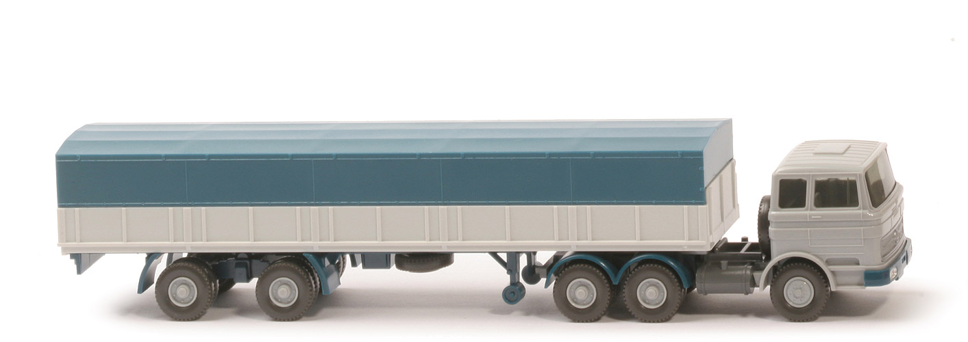 | | Zugmaschine | | Typ | Dach längsversteift | | Kabine | silbergrau | | Spiegel | ohne | | Scheibenwischer | ohne | | Verglasung | getönt | | Lenkrad | ohne | | Inneneinrichtung | ca. hellgelbgrau | | Stoßstange | ozeanblau, Scheinwerfer gesilbert | | Chassis | basaltgrau | | Zentriernippel für Pritsche | ohne | | Radlauf hinten | zweiteilig ozeanblau | | Reserverad | hinter Kabine | | Sattelpfanne | für großen KöBo | | Räder | Profil grob | | Felgen | silbergrau | | | Auflieger | | Pritsche Farbe | altweiß | | Chassis Farbe | ozeanblau | | Pritscheneinlage | Pappe, silbern | | Plane Farbe | ozeanblau | | Reserverad | unter Auflieger, gesteckt | | Unterfahrschutz | ohne | | Königsbolzen | stark | | Räder | Profil grob | | Felgen | silbergrau |