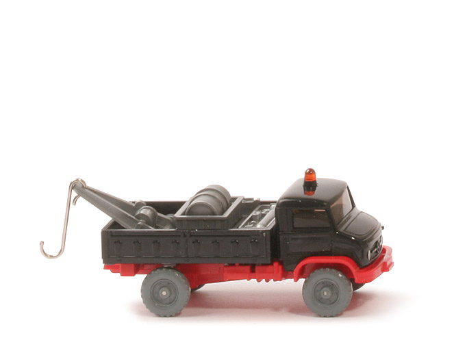 | Farbe Kabine | schwarz | | Version Kabine | geschlossen | | Dach | mit einer Warnlichtaufnahme | | Warnlicht | eins, groß, auf Sockel, orange transparent | | Verglasung | stark getönt | | Inneneinrichtung | ohne | | Bedruckung Kabine | Scheinwerfer silbern | | Chassis Farbe | "verkehrsrot" | | eingesetzte Kardaneinheit | "verkehrsrot" | | Chassis Typ | vor Hinterachse geschlossen | | Bodenprägung | neues WIKING-Logo, Germany | | Zughaken | Mikrohaken | | Tanks, Luftbehälter | unten geschlossen | | Reserverad | auf Chassis | | Pritsche | schwarz | | Ladung | Geräteeinsatz | | Farben Geräteeinsatz | silbern | | Ladung des hohen Stapelkastens | Tonne | | Räder | 10mm, grobstollig | | Farbe Räder | ca. staubgrau |