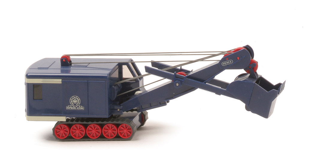 | Oberwagen Oberteil | nachtblau | | Oberwagen Unterteil | nachtblau | | Verglasung | klar, IE rot | | Unterwagen Oberteil | nachtblau | | Unterwagen Unterteil | nachtblau | | hier Bodenprägung | neues WIKING-Logo | | Ausleger | nachtblau | | Löffelstiele | nachtblau | | Baggerlöffel | nachtblau | | Laufrollen für Seilzugmechanik | rot | | Laufräder | 6,5 mm 8-Stern-Felge, rot | | Gummiraupen | ca. anthrazit | | Verseilung | Gummi staubgrau | | Beschriftung Oberwagen Seite | "Menck-Hambrock, Hamburg Altona" | | Beschriftung Oberwagen Heck | "Menck", weiß | | weitere Beschriftung Oberwagen | Zierstreifen weiß | | Beschriftung Ausleger | Menck weiß |