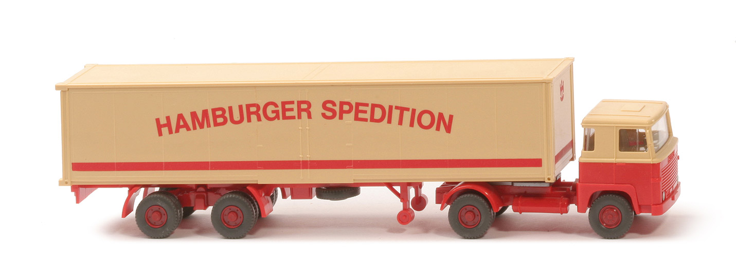 | | Zugmaschine | | Dach | hellbeige | | Kabine oben | hellbeige | | Kabine unten | orangerot | | Stoßstange | orangerot | | Scheinwerfer | 2, gesilbert | | Spiegel | mit | | Scheibenwischer | ohne | | Lenkrad | mit | | Sattelpfanne | für großen Königsbolzen | | Reserverad | ohne | | Chassis Farbe | orangerot | | Räder | 12mm, Profil grob | | Felgen | hellbraunrot | | | Koffer | | Art | mit Seitentür-Andeutung | | Dach | hellbeige | | Korpus | hellbeige | | Türen | neu, hellbeige | | Beschriftung | Hamburger... (s. Foto) | | Chassis | orangerot | | Unterfahrschutz | ohne | | Königsbolzen | stark | | Räder | 12mm, Profil grob | | Felgen | hellbraunrot |