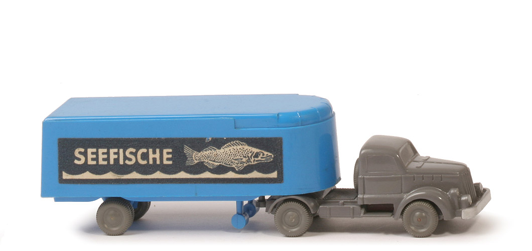 Achsen | Rollachser | | Zugmaschine | Farbe Kabine | basaltgrau | Farbe Chassis | basaltgrau | Bemalung | Scheinwerfer, Stoßstange | Sattelpfanne | eingesetzt, in Chassisfarbe | Chassis | Version 1b | Achshalterungen | geschlossen | Bodenprägung | WM (ohne Kreis) | Reserverad | hinter Kabine | Räder | mit Profil, basaltgrau | | Auflieger | Farbe Oberteil | himmelblau | Farbe Unterteil | himmelblau | Radlauf | ohne Kotflügel | Bodenprägung | WM im Kreis | Rückleuchten | ohne | Dach | glänzend | Aufkleberart | Papier, matt | Beschriftung | Seefische (s. Foto) | Räder | mit Profil, basaltgrau |