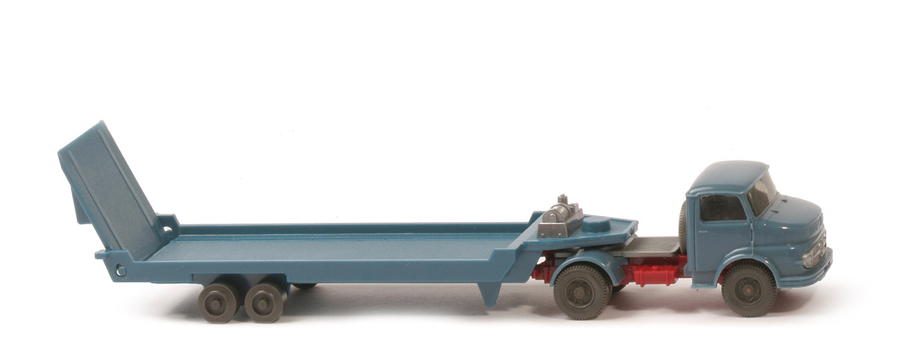 | Zugmaschine | Kabine | mattgraublau | Lüfter | ohne - Dach glatt | Verstärkung hinter Nrn-Schild | mit | Blinker | neben Scheinwerfern | Verglasung | getönt | Inneneinrichtung | ohne | Bemalung | ohne | Farbe Chassis | hellbraunrot | Bodenprägung | Wiking Germany | Radlauf hinten | mattgraublau | Sattelpfanne | neu, für dünnen Bolzen | Reserverad | hinter Kabine | Räder | 11 mm, 6-Loch. Profil grob, anthrazit | | Auflieger | Typ | vorn eckig | Seilwinde | silbern | Knopf vor Seilwinde | mit | Rückleuchten | mit | Stützen | mit | Bodenprägung | 49/WM/Wiking/Made in Germany | Königsbolzen | pilzförmig, silbern eingesetzt | Farbe | azurblau | Räder | glatt, anthrazit (!) |