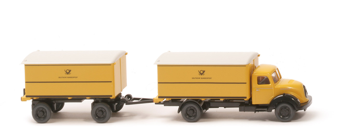 | Zugwagen | Farbe Kabine | "honiggelb" | Verglasung | klar | Inneneinrichtung | ca. anthrazit, mit separatem Lkr | Bedruckung Scheinwerfer | silbern | Bedruckung Grill | Logo, Räder silbern, Fläche schwarz | Bedruckung Kabine seitlich | Magirus Deutz, Zierliene, Türgriffe | Chassis Farbe | schwarz | Chassis Art | Neuauflage | Chassis Bodenprägung | neues WIKING-Logo | mittlerer Chassisbereich | geschlossen | Kupplung vorn | ohne | Zughaken | Mikro-Zughaken | Koffer | Typ 5 | Koffer Farbe | "honiggelb" | Rückleuchten | neu, rot bedruckt | Positionslichter vorn | mit | Türaufnahmen | unten geschlossen | Türen Farbe | "honiggelb" | Türen Typ | Griff als Lasche, mit Rand | Dach | glatt, mit Rand und Positionsleuchten | Dach Farbe | ca. lichtgrau | Beschriftung | Horn, Deutsche Bundespost ... (s. Foto) | Räder | 11mm, Felgen schwarz eingesetzt | | Anhänger | Koffer | wie Zugwagen | Chassis Typ | Typ 5, Zug integriert, ähnlich | Chassis Farbe | schwarz | Chassis Bodenprägung | neues WIKING-Logo, Germany | Räder | 11mm, Felgen schwarz eingesetzt |