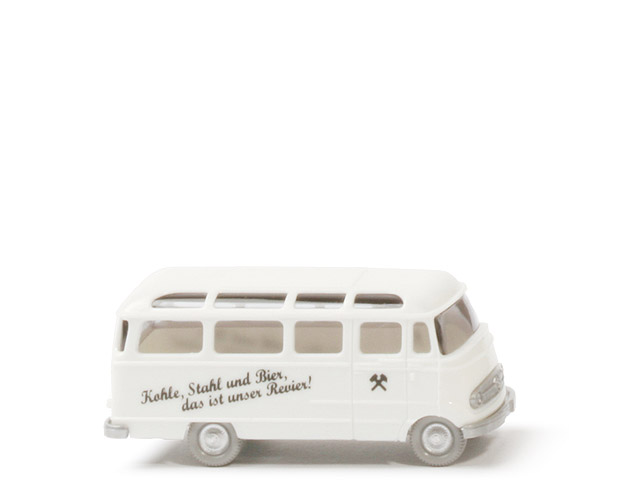 Farbe Karosserie | weiß | Bedruckung Türen | Zechensysbol | Bedruckung Seiten | "Kohle, Stahl und Bier das ist unser Revier" | Grill | silbern eingesetzt | Bedruckung Grill | ohne | Bedruckung Heck | ohne | Verglasung | fast klar | Inneneinrichtung | ohne | Rückleuchten | stark erhaben | Chassisfarbe | silbern lackiert | Bodenprägung | neues WIKING-Logo, Germany | Räder Typ | die Riffelkappe | Räder Farbe | ca. platingrau, Felgen silber |