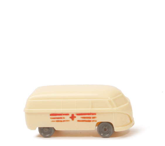 Achsen | Rollachser | Karosserie oben | cremeweiß | Seite | nur ein Seitenfenster | Front | VW Emblem | Karosserie unten | cremeweiß | Bodenprägung | WM (im Kreis) | Blaulicht | ohne | Bemalung Scheinwerfer | ohne | Bemalung Stoßstange vorne | ohne | Bemalung Heck | ohne | Scheibensilberung | ohne | Beschriftung | Rotes Kreuz mit Streifen | Beschriftung Art | Stempeldruck | Räder Typ | 8 mm, ohne Profil | Räder Farbe | ca. basaltgrau |