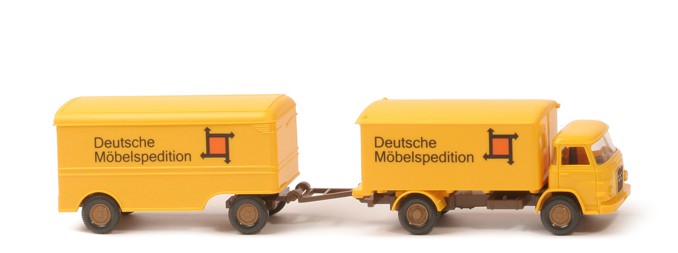 | Zugwagen | Farbe Kabine | gelb | Verglasung | klar | Grill | integriert, M.A.N.-Emblem nicht geprägt | Bedruckung Grill | M.A.N., Rand silbern, blassbraune Hinterlegung | Bedruckung Scheinwerfer | silbern | Inneneinrichtung | 2 Sitze, Motorblock, Lkr integriert | Farbe Innenrichtung | ca. anthrazit | Chassis Farbe | blassbraun | Bodenprägung | GERMANY, WM (altes Logo) | Tank Beifahrerseite | eckig | Rücklichtstange | mit | Abstützung des Koffers | Stege | Aussparung Reserverad | mit | Reserverad | ohne | hinterer Kotflügel | gelb | Koffer | Typ 2f, Dach, Korpus u. Türen gelb | Rückleuchten | alt, unbemalt | Positionslichter vorn | mit | Beschriftung | Deutsche Möbelspedition ... (s. Foto) | Räder | 11 mm, 2-teilig, 6-Loch Felgen ockerbraun | | Anhänger | Aufbau Farbe | Dach, Korpus u. Türen gelb | Kotflügel | Teil des Aufbaus | Chassis Farbe | blassbraun | Bodenprägung | neues WIKING-Logo, Germany | Drehschemel | blassbraun | Deichsel | blassbraun | Beschriftung | Deutsche Möbelspedition ... (s. Foto) | Räder | 11 mm, 2-teilig, 6-Loch Felgen ockerbraun |
