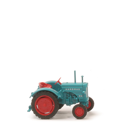 Bauteil vorne | blautürkis (Motor, Chassis, Zughaken, Pedale links) | hier: Auspuff | integriert | hier: Luftansaugung | blautürkis, separat eingesetzt | hier: Lenkrad | rot, 3-speichig, separat eingesetzt | hier: Druck seitlich | "Hanomag", rechts zusätzlich "R 16", weiß | hier: Druck Front | Hanomag-Logo weiß, Scheinwerfer und Grill silbern | Pendelachsaufhängung | blautürkis | Bauteil hinten | blautürkis (Kotflügel hinten, Trittfläche, Pedale rechts) | hier: Sitz | rot, eingesteckt | hier: Bedruckung Rückleuchten | ohne | Ackerschiene | blautürkis | hier Bodenprägung | neues WIKING-Logo | Räder vorne | Gummi, 8 mm | Räder hinten | Gummi, 15 mm | Felgen | rot |