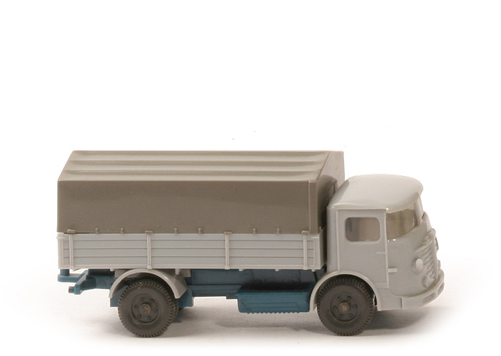 Kabine | silbergrau | Türgriffe | gerade | Inneneinrichtung | ohne | Blinker | mit | Chassis Farbe | azurblau | Bodenprägung | WM und Germany | Rücklichtstangen | mit | Zughaken | integriert | Befestigungspunkt Pritsche | ohne | Pritsche Ausführung | neu | Pritsche Farbe | silbergrau | Pritscheneinlage | silber, längsgeteilt | Plane | offen, gerafft | Plane Farbe | ca. steingrau | Räder | 11 mm, 6-Loch Standard |