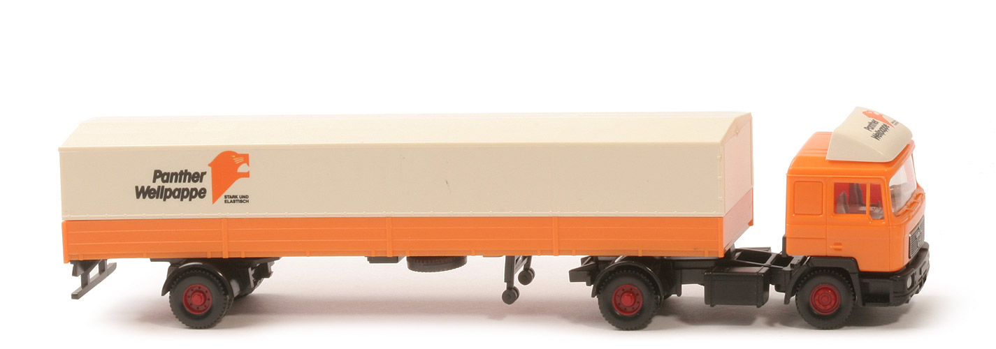| Zugmaschine | Kabine | rotorange (Spoiler cremeweiß) | eingesetzter Grill | schwarz | Bedruckung Grill | Rand, MAN-Logo, Löwe silbern | Inneneinrichtung | ca. graubeige, Lkr separiert | Kabinenunterbau | schwarz | Stoßstange, Kotflügel | schwarz | Chassis | schwarz | Kardaneinsatz | schwarz, Bodenprägung neues WIKING-Logo, Germany | Radlauf hinten | schwarz | Reserverad | unter Chassis | Räder | Profil grob | Felgen | 8-Loch, weinrot | | Auflieger | Pritsche Art | Langpritsche 4-fach-Teilung | Farbe Pritsche | rotorange | Pritsche Bodenprägung | WIking, Berlin-W, 134-8 | Pritscheneinlage | Pappe, silbern | Plane | ca. cremeweiß | Plane Innenprägung | Wiking, < 134-15 | Einsachsaggregat Farbe | schwarz | Heck | gerade | Warndreiecke | neben Rückleuchten | Unterfahrschutz | mit | Beschriftung Plane Seite | "Panther Wellpappe", ... siehe Foto | Beschiftung Plane hinten | Folie "Altonaer Wellpappenfabrik" | Räder | Profil grob | Felgen | 8-Loch, weinrot |