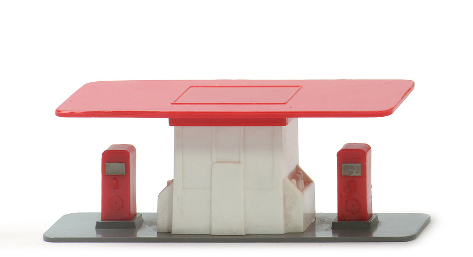 | Dach Typ | eckig, glatt | | Dach Farbe | rot | | Gebäude Typ | unverglast | | Gebäude Farbe | weiß | | Fenster Bemalung | ohne | | Öldosen | integriert | | Zapfsäulen Typ | geschlossen | | Zapfsäulen Farbe | rot | | Zapfsäulen Bemalung | Anzeigefeld ca. silbergrau | | Bodenplatte Farbe | basaltgrau | | Bodenplatte Oberseite | glatt | | Bodenplatte Unterseite | glatt | | Bodenprägung | ohne |